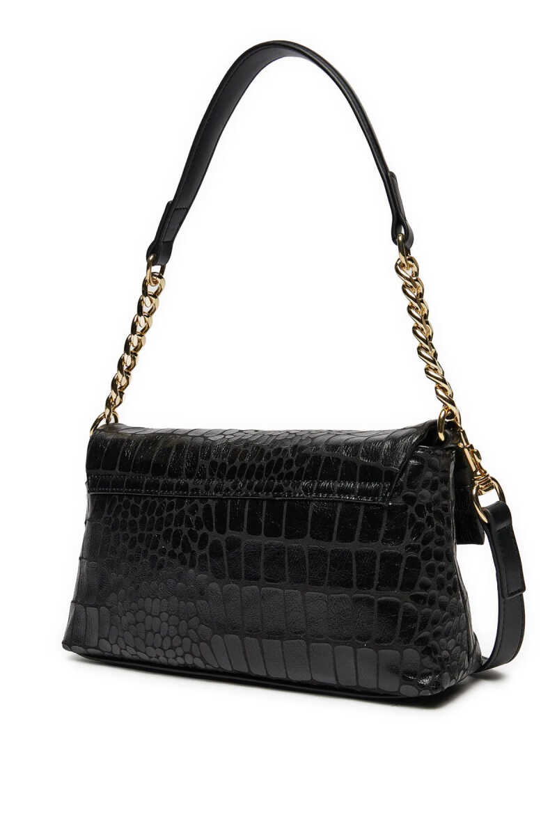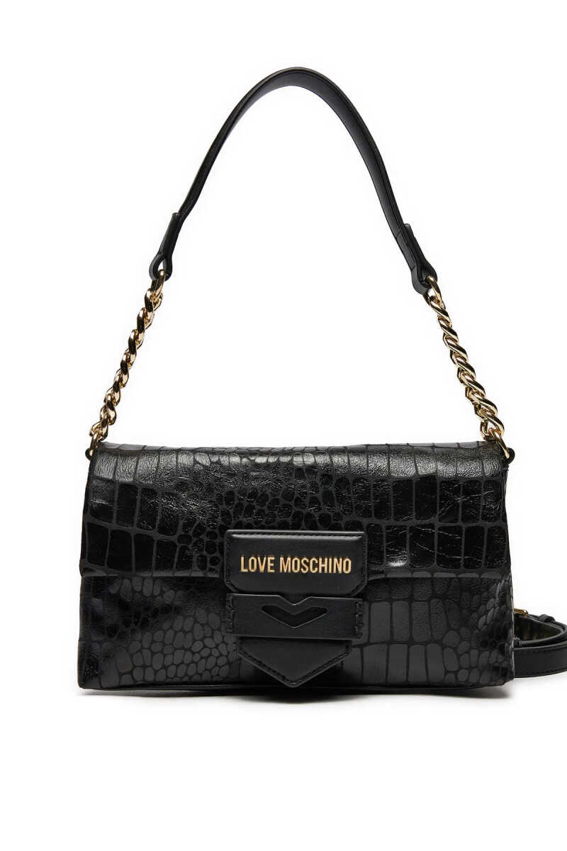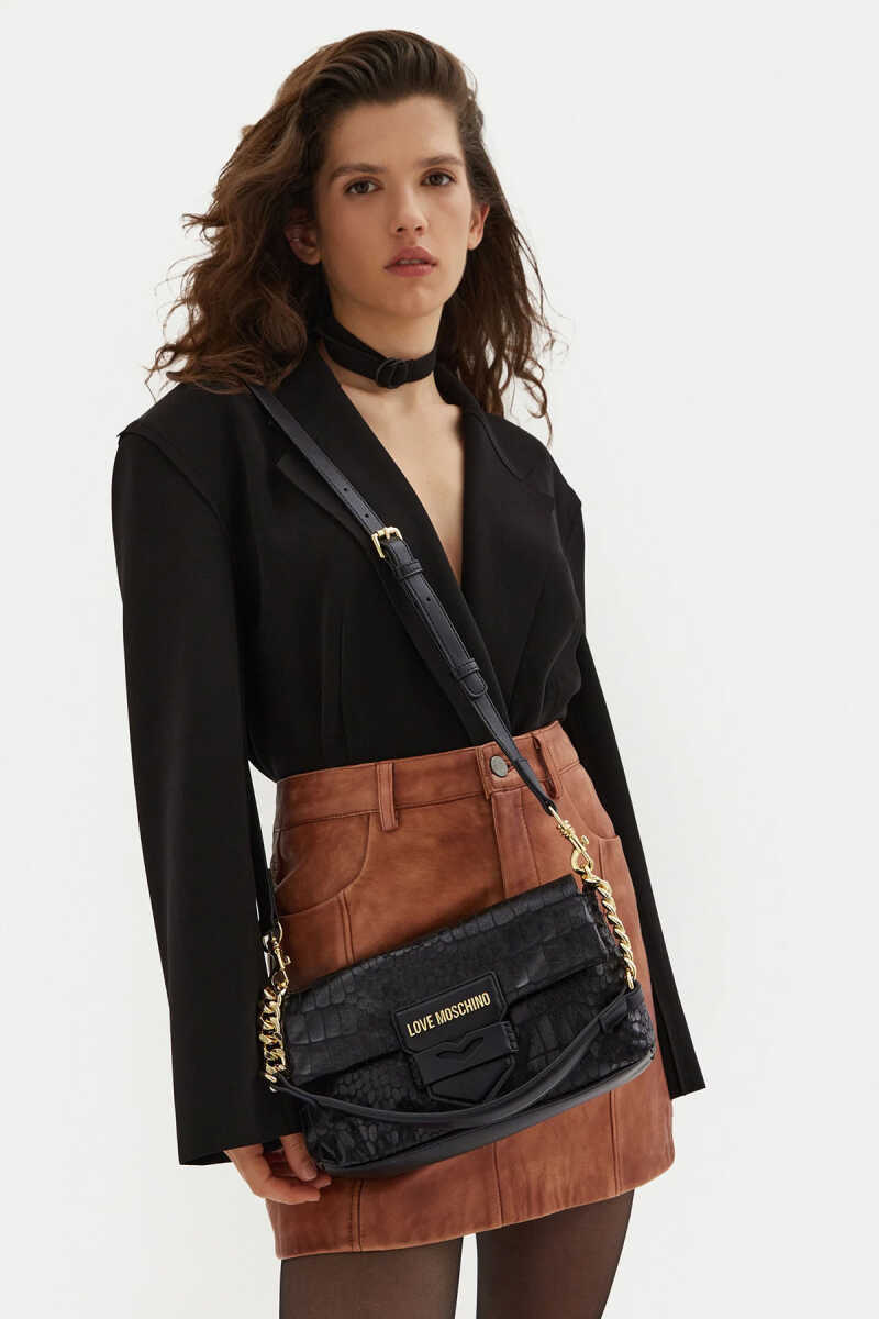 Love Moschino siyah mini çanta, manyetik kapamalı kapak tasarımı ve modern görünümüyle günlük kombinlere şık ve pratik bir dokunuş katar.