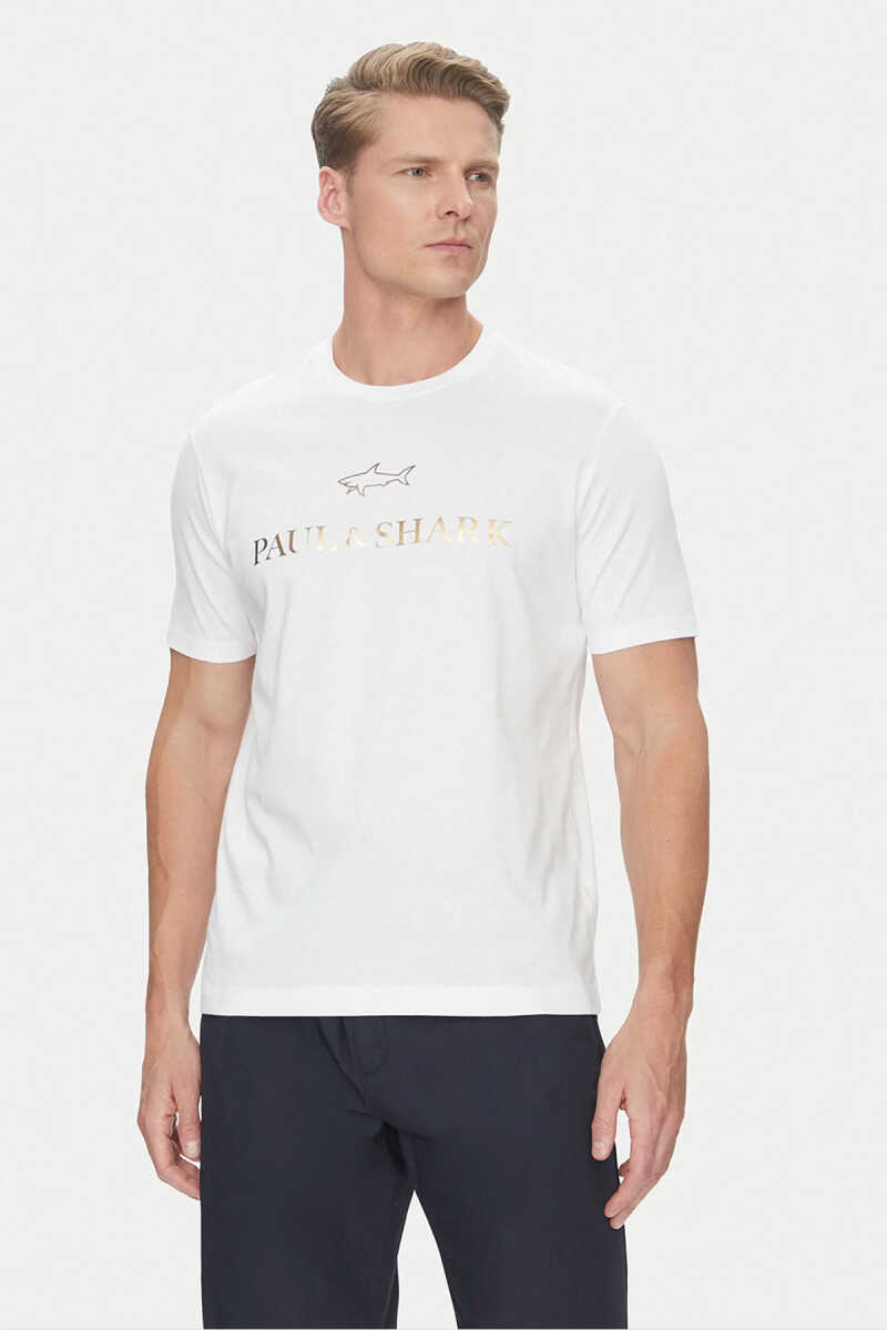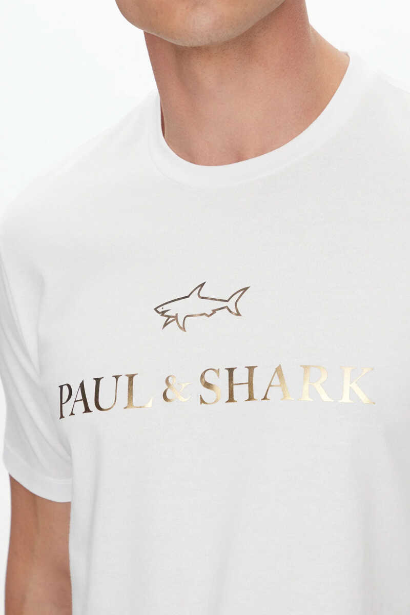 Paul & Shark beyaz pamuklu tişört, gold logo baskısı ve rahat kalıbıyla günlük kombinlere şık, modern ve konforlu bir stil kazandırır.