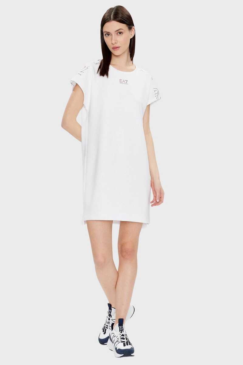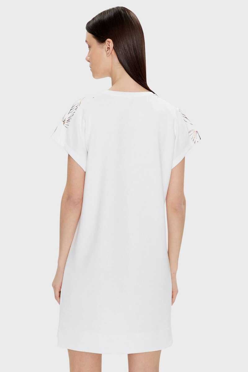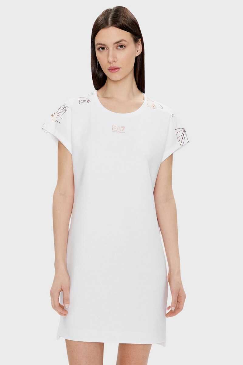 Emporio Armani'nin omuzlarında altın detaylı beyaz elbisesiyle saflık ve zarafeti bir araya getirin, her ortamda parlayın!