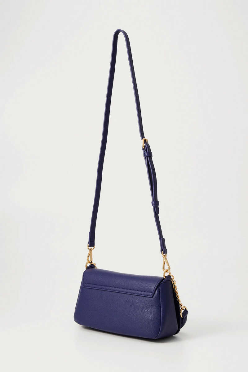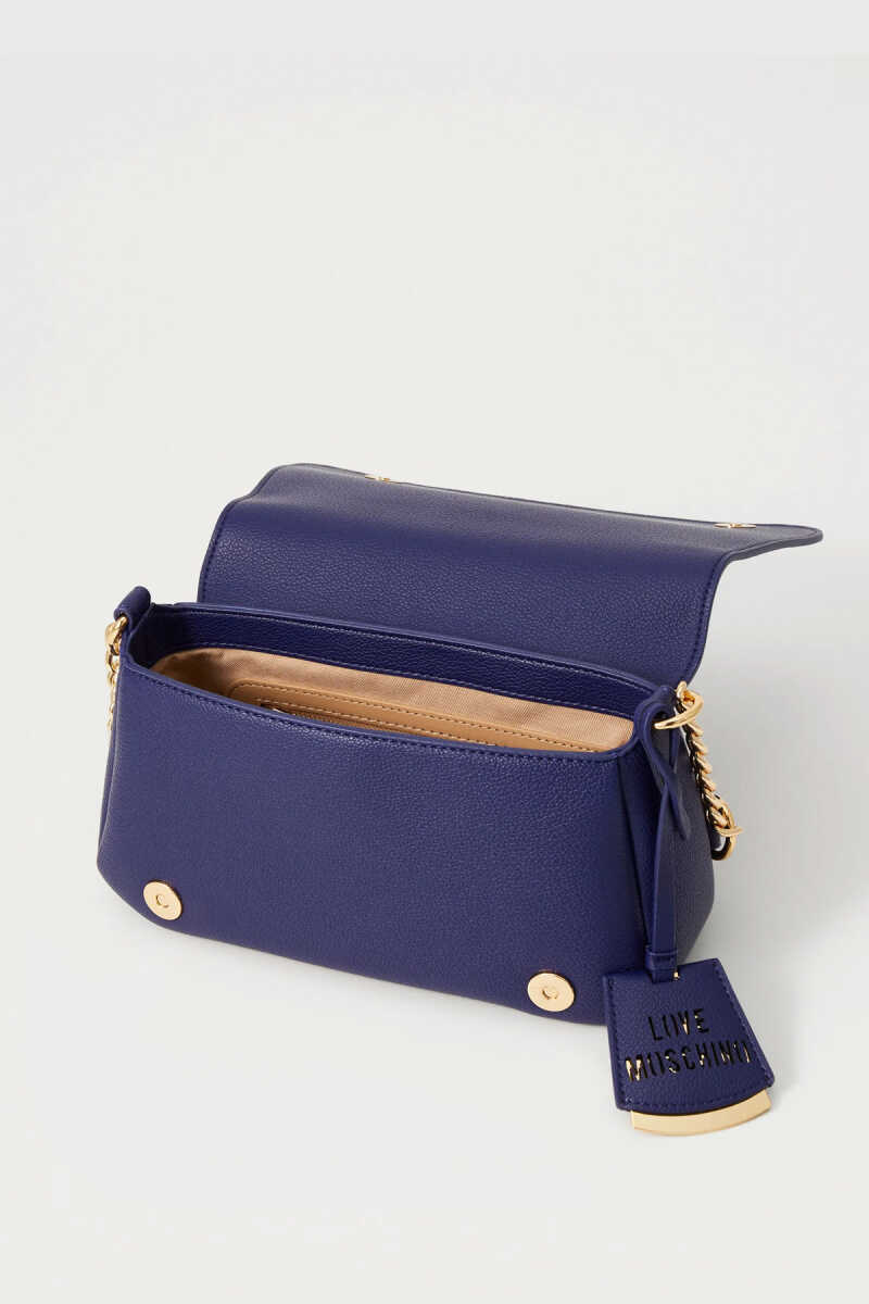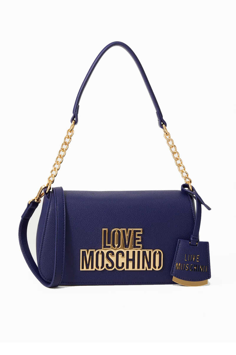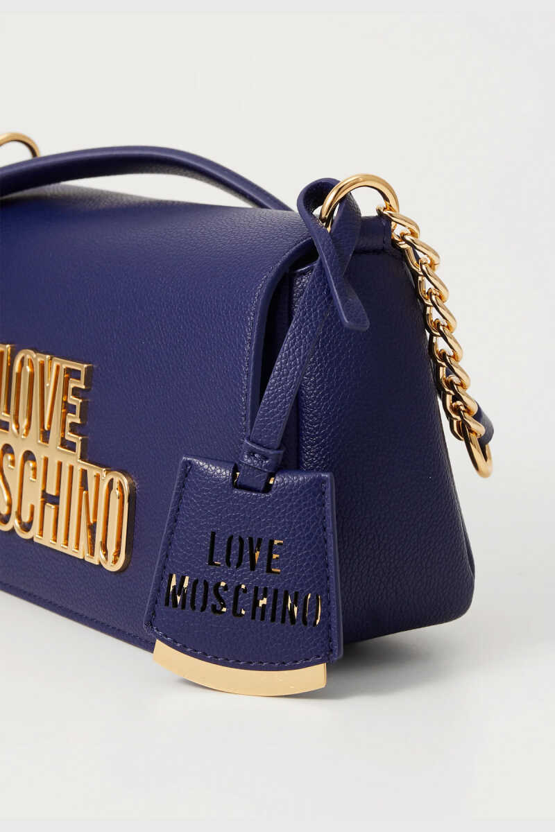 Love Moschino lacivert kadın çanta, logolu kapak tasarımı ve ayarlanabilir askısıyla günlük kombinlere şık ve modern bir dokunuş katar.