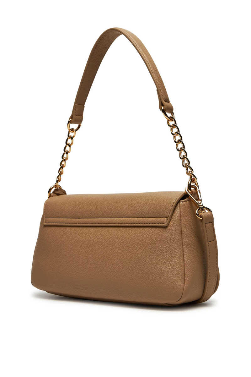 Kahverengi kadın çanta, logolu kapak tasarımı ve ayarlanabilir askısıyla günlük kombinlere sıcak, şık ve modern bir dokunuş katar.