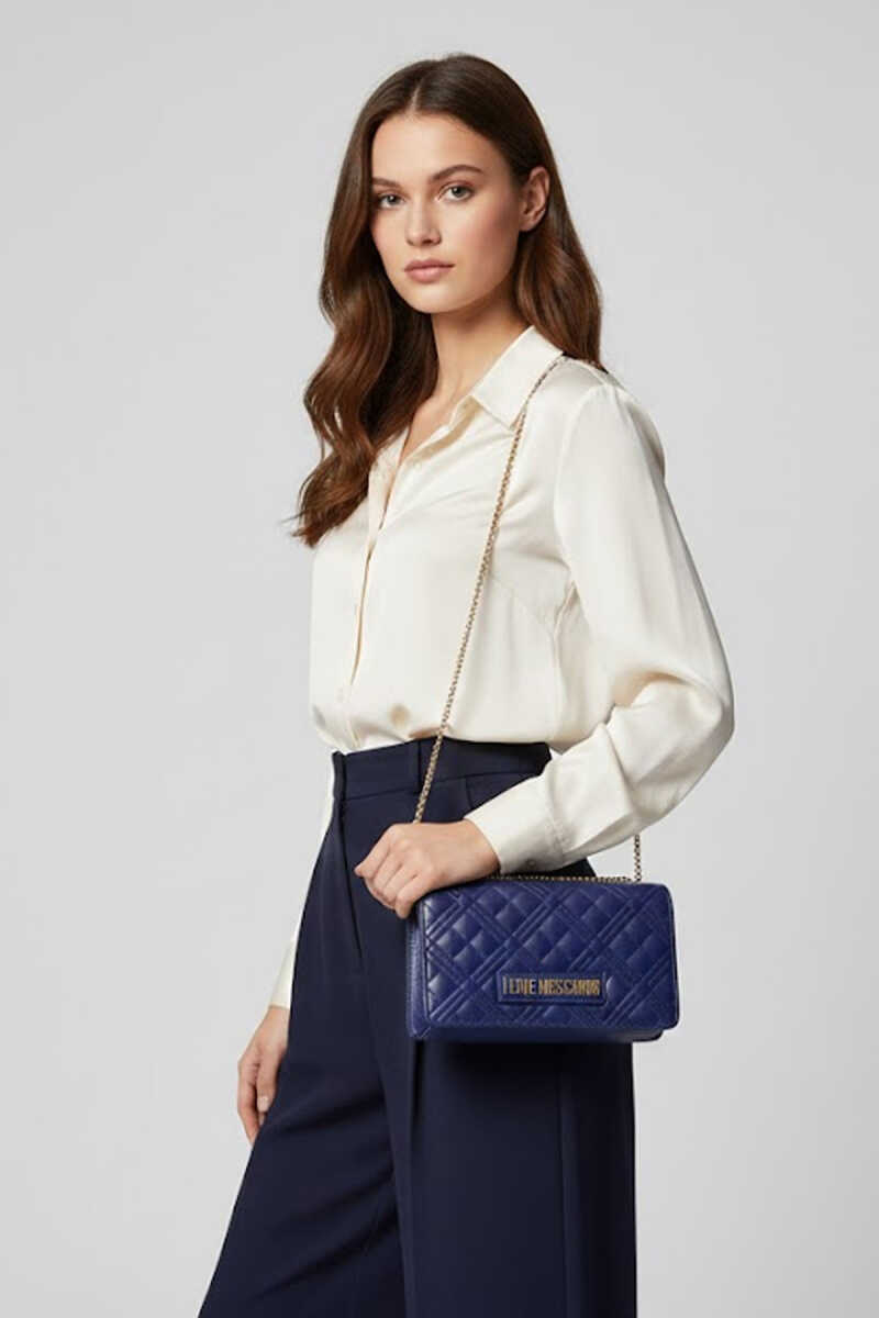 Lacivert Love Moschino çanta, zincir detaylı modern tasarımıyla her kombine uyum sağlar. Hem şık hem pratik yapısıyla günlük kullanım için idealdir.