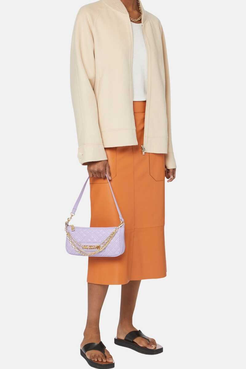 Love Moschino'nun lila çantası, şıklığınıza tatlı bir dokunuş katıyor. Küçük boyutuyla her an yanınızda taşıyabileceğiniz pratik ve şık bir seçenek.